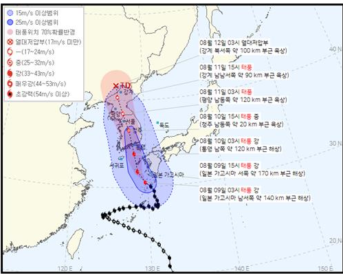 9~11일 사이 전남 동부 남해안과 경상권 해안에는 40m/s 강풍으로 외출을 자제하는 것이 좋고 이 정도 수준은 사람이 무언가를 붙잡지 않으면 서 있을 수 없는 강도의 세기 입니다.